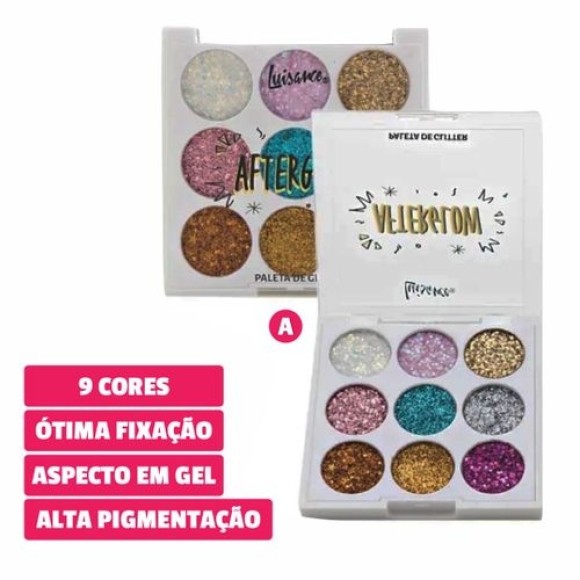 A Paleta de Sombras Afterglow Luisance, possui uma ótima fixação e simetria, com aspecto de gel com muito brilho e pigmentação, possui 9 cores maravilhosas para vc combinar e arrasar!