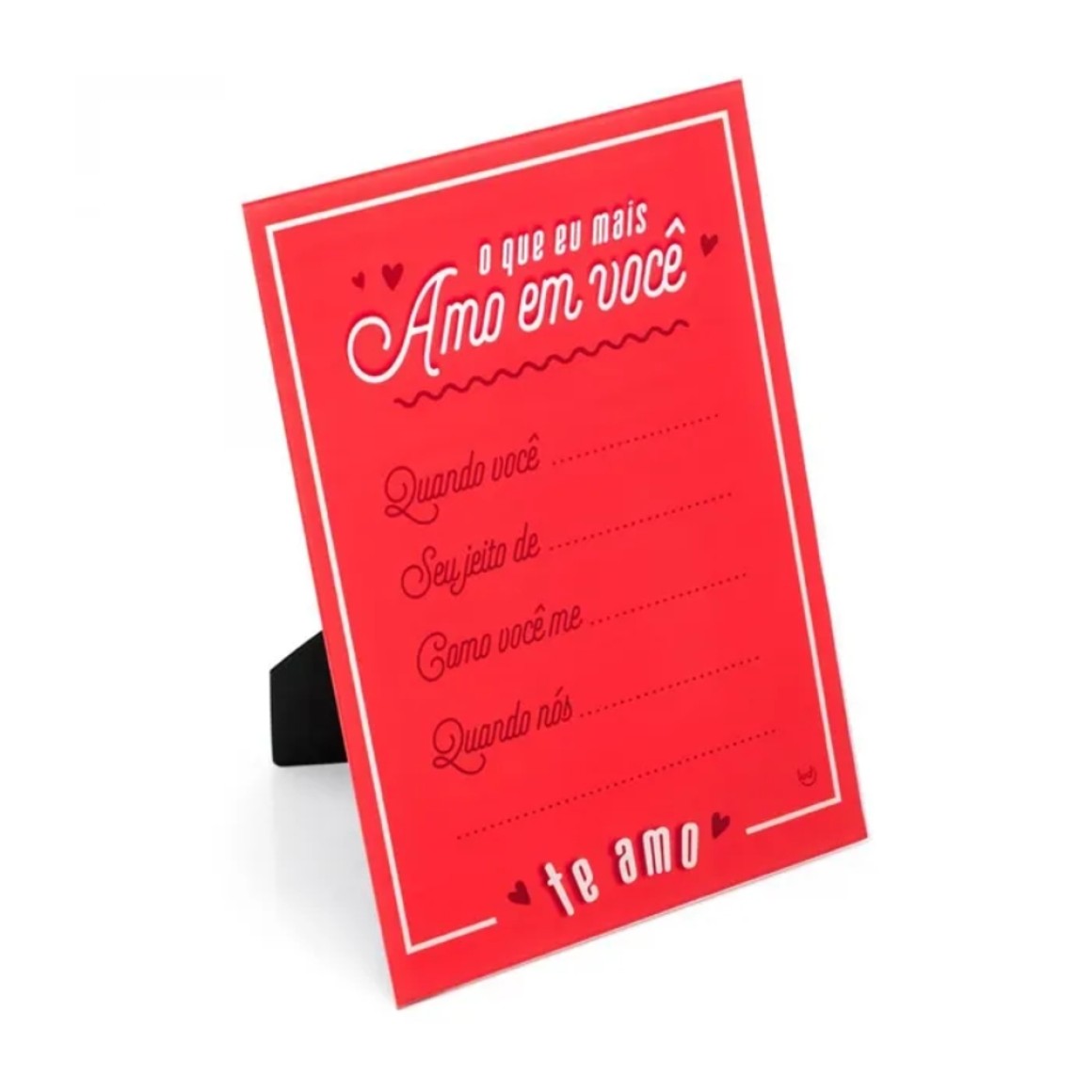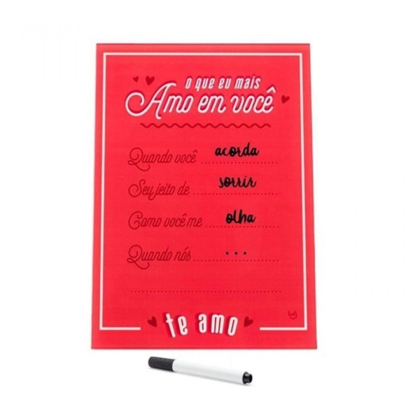 Então por que não inovar no presente do seu amor com este quadro customizável pra lá de romântico? Começa com "o que eu mais amo em você", continua com algumas dicas pra você completar ao pensar no seu amor e termina com uma linda declaração: "te amo". Para deixar o presente mais legal, já vem com 1 caneta. Aí é só se inspirar!