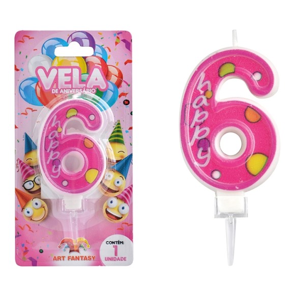 VELA DE ANIVERSÁRIO NÚMERO 6 COR ROSA ART FANTSY
