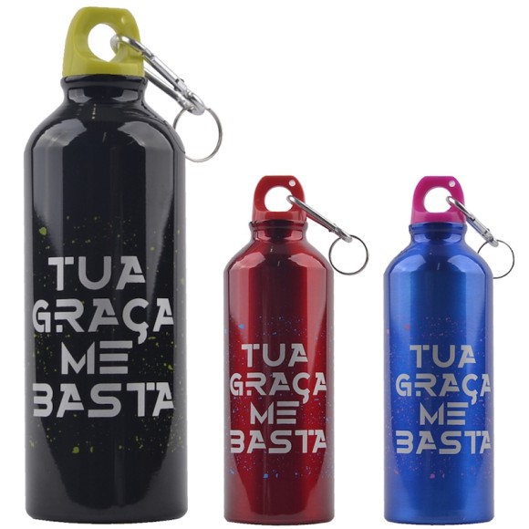 Suas bebidas com muito mais praticidade com a Garrafa Squeeze de Alumínio 500 ml Tua Graça Me Basta Sortida da Wellmix!